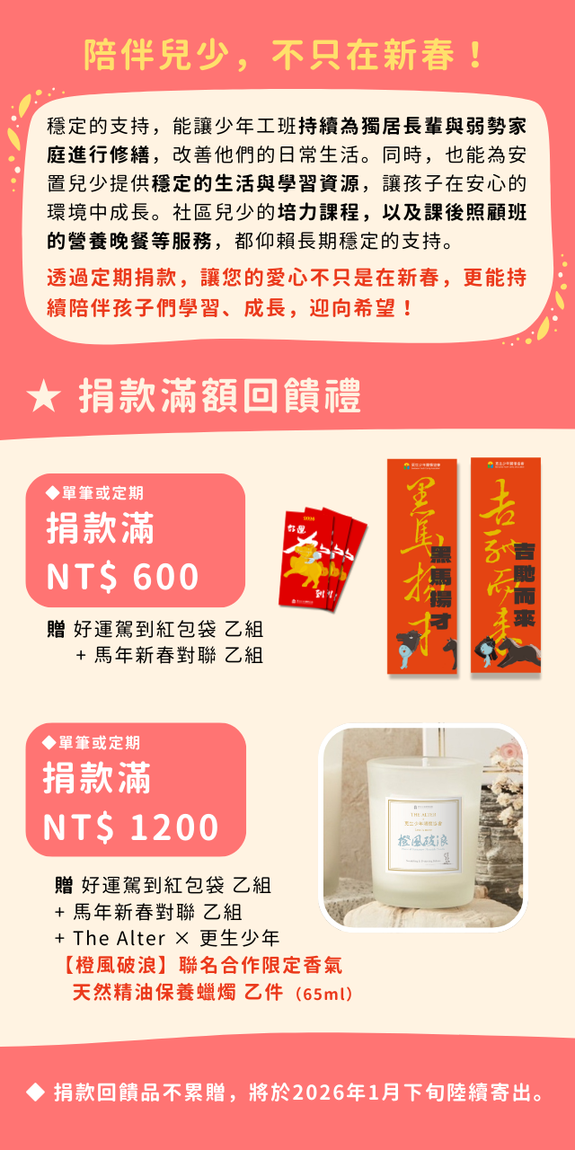 邀請你捐款支持「新春兒少陪伴計畫」,一起將每一份捐款化為一桌年夜飯、一件新衣、一次不缺席的陪伴,讓這些孩子與長輩在新年多一份團圓,也多一份希望!