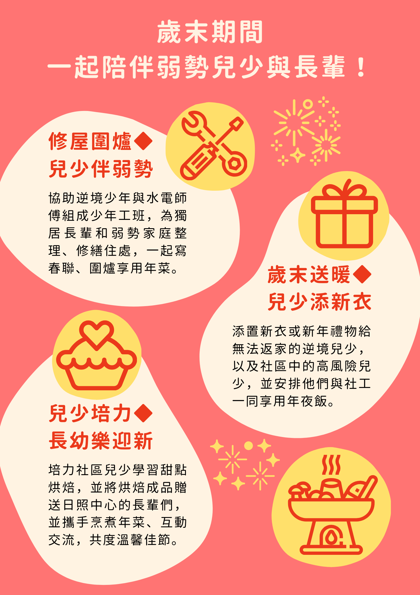 2026 農曆春節,協會據點「新北市少年培力園」的青少年將組成少年工班,走入長輩們的家中,協助 3 戶獨居長者修繕住處、圍爐、寫春聯,並關懷 15 戶弱勢家庭,致贈年菜與年節物資。
