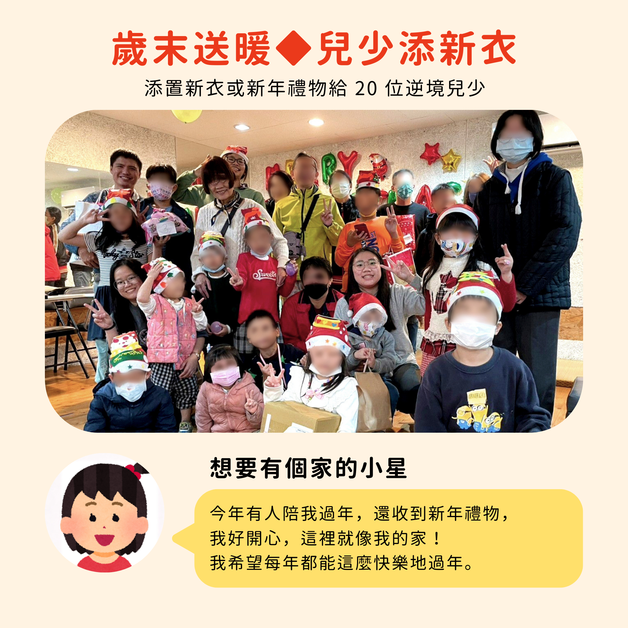 ▸▸ 歲末送暖◆兒少添新衣(關懷 20 位逆境兒少)
